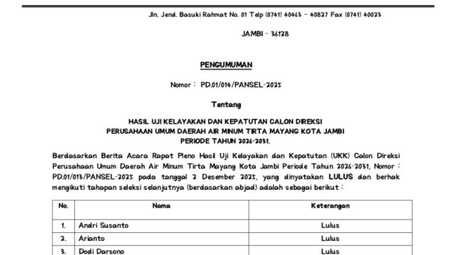 10 Nama Kandidat Direksi PDAM Tirta Mayang Diumumkan