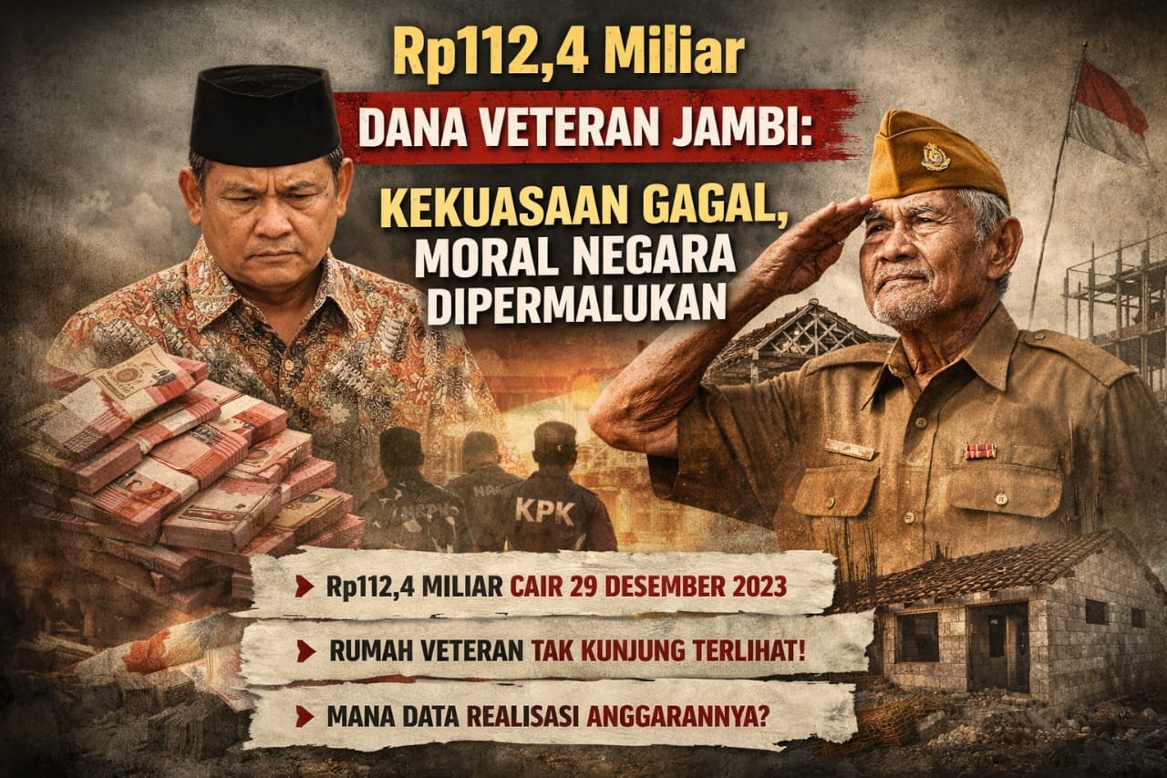 Inijambi.com – Negara boleh salah kelola proyek, tetapi tidak punya hak moral untuk mengkhianati veteran. Ketika Rp112,4 miliar Dana Alokasi Umum (DAU) Tahun 2023 disebut dialokasikan untuk pembangunan rumah veteran di Provinsi Jambi, lalu bangunannya tak pernah terlihat, maka yang runtuh bukan hanya administrasi—yang runtuh adalah martabat kekuasaan.