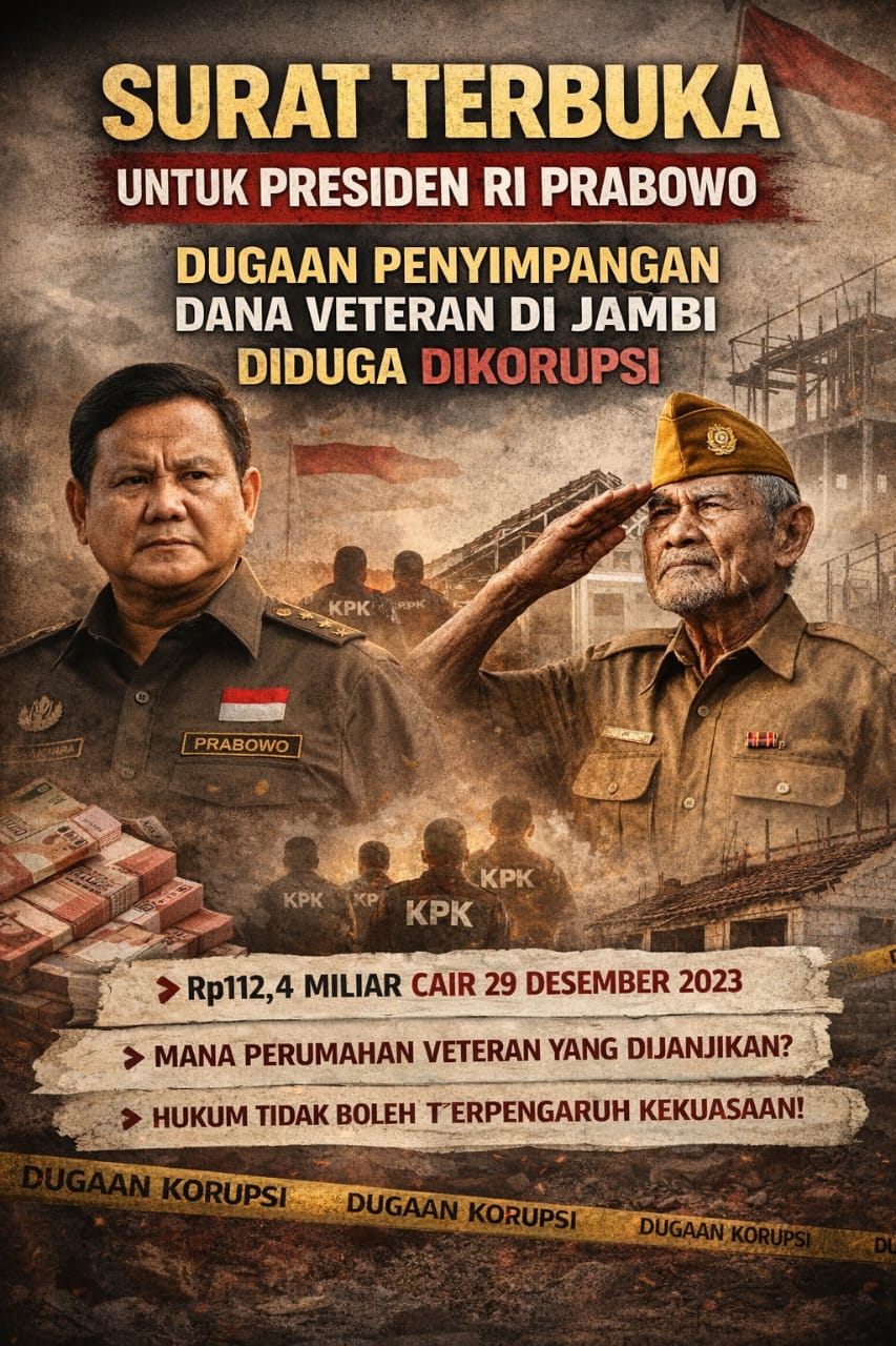 Surat terbuka ini saya sampaikan sebagai bentuk kepedulian dan tanggung jawab moral warga negara terhadap isu dugaan penyimpangan Dana Alokasi Umum (DAU) Tahun 2023 sebesar Rp112,4 miliar yang disebut dialokasikan untuk pembangunan rumah veteran di Provinsi Jambi, namun hingga kini belum terlihat wujud fisik pembangunannya secara terbuka dan terverifikasi publik.