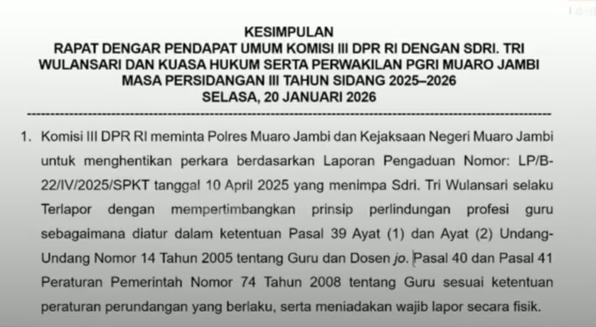 “Komisi III DPR RI meminta Polres Muaro Jambi dan Kejaksaan Negeri Muaro Jambi untuk menghentikan perkara berdasarkan Laporan Pengaduan Nomor: LP/B-22/IV/2025/SPKT tanggal 10 April 2025 yang menimpa Sdri. Tri Wulansari selaku Terlapor,” demikian kesimpulan RDP yang dipimpin oleh Habiburokhman.