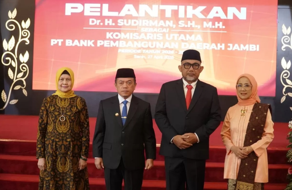INIJAMBI.COM- Gubernur Jambi, Al Haris, secara resmi melantik Sudirman sebagai Komisaris Utama PT Bank Pembangunan Daerah (BPD) Jambi untuk periode 2026–2030. Pelantikan berlangsung di Auditorium Rumah Dinas Gubernur Jambi, Senin (27/04/2026) pagi, dihadiri perwakilan Bank Indonesia, Otoritas Jasa Keuangan (OJK), Forkopimda, kepala daerah, serta jajaran manajemen Bank Jambi.