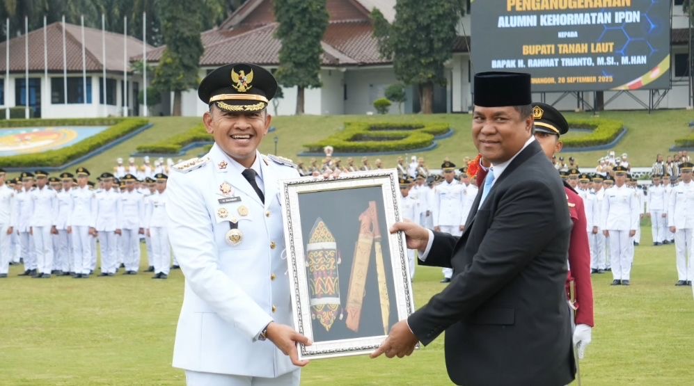 INIJAMBI, Jatinangor – Bupati Tanah Laut (Tala), H. Rahmat Trianto menerima penghargaan istimewa sebagai Alumni Kehormatan Institut Pemerintahan Dalam Negeri (IPDN). Penyematan pin kehormatan itu berlangsung pada upacara resmi di Lapangan Parade Kampus IPDN Jatinangor, Sumedang, Jawa Barat, pada Sabtu (20/9/2025).