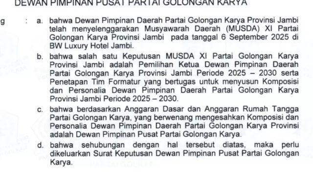 Inilah Daftar Kepengurusan DPD I Golkar Jambi 2025 – 2030